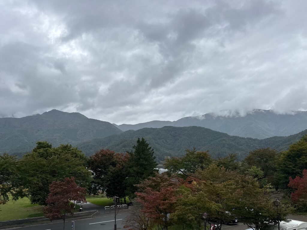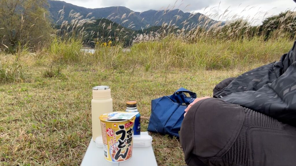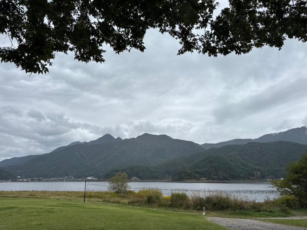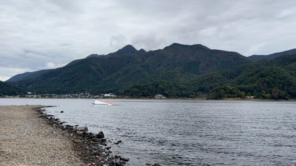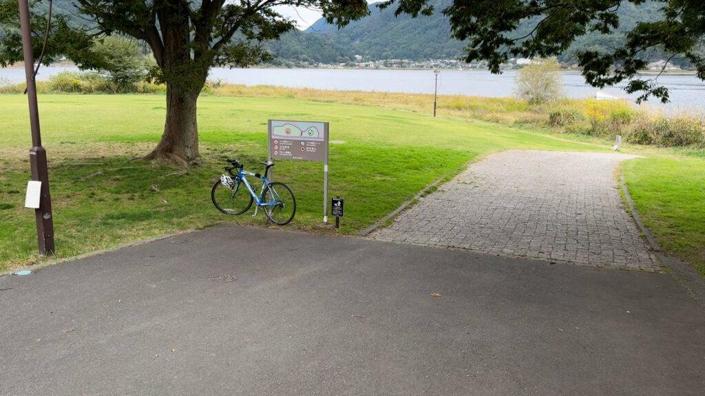 道の駅の正面で、河口湖沿いの公園。ここでさっき買ったカップうどんを食べる。