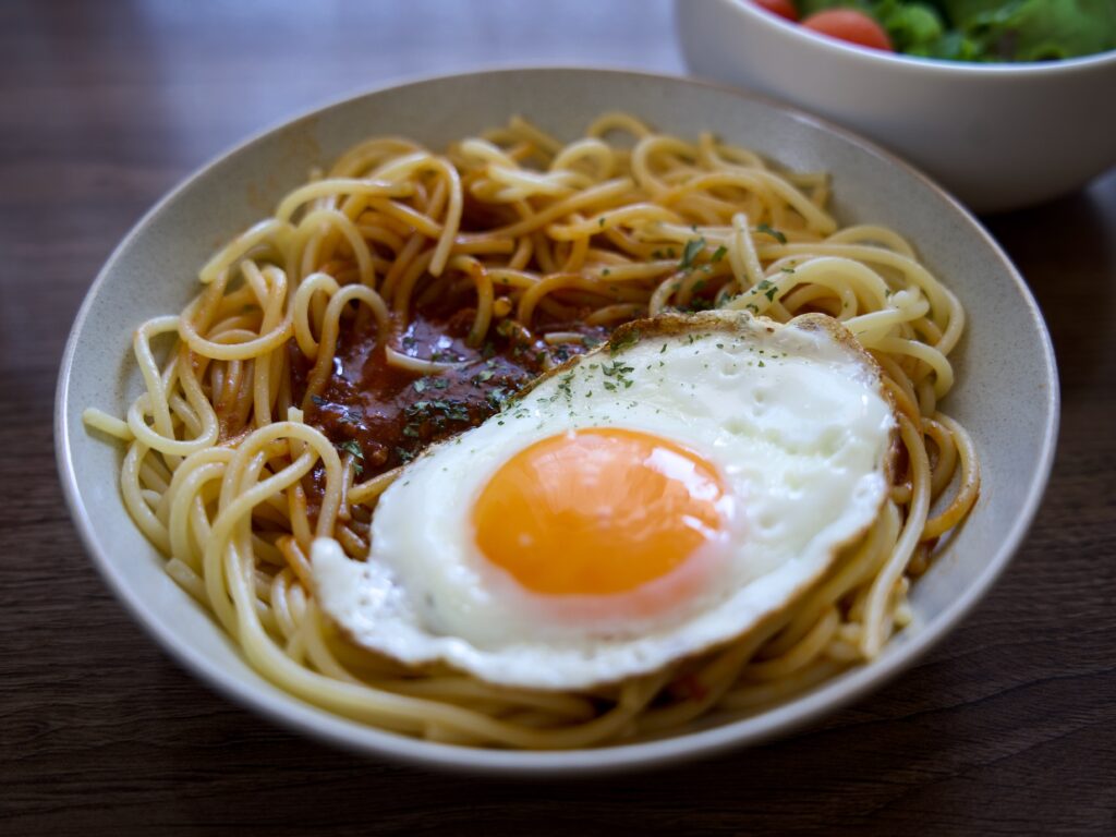 目玉焼きのせボロネーゼパスタ