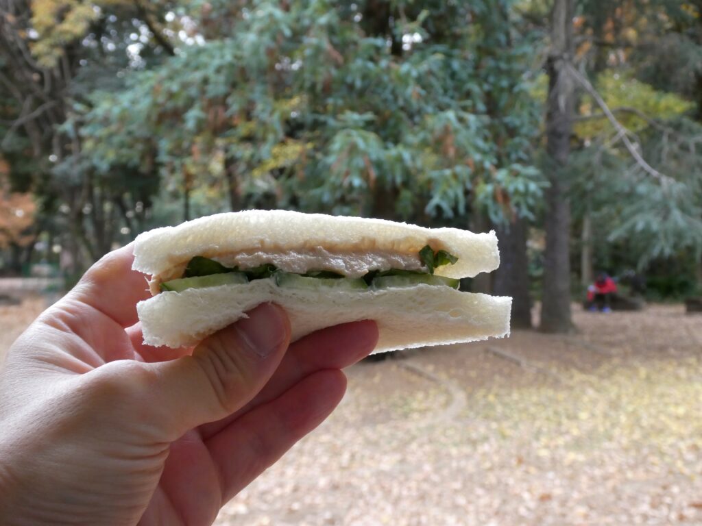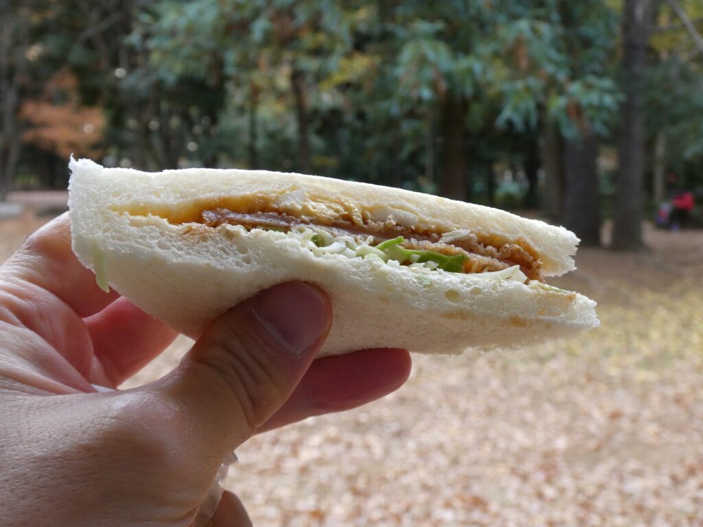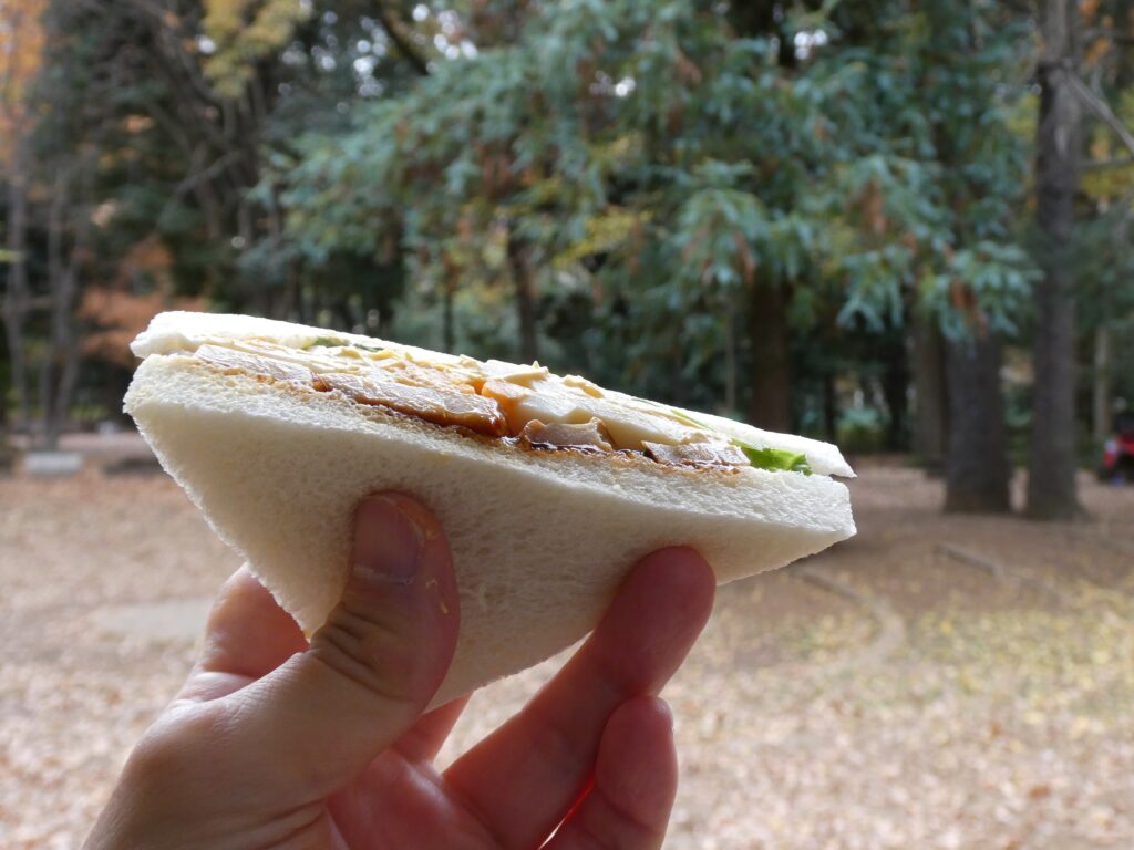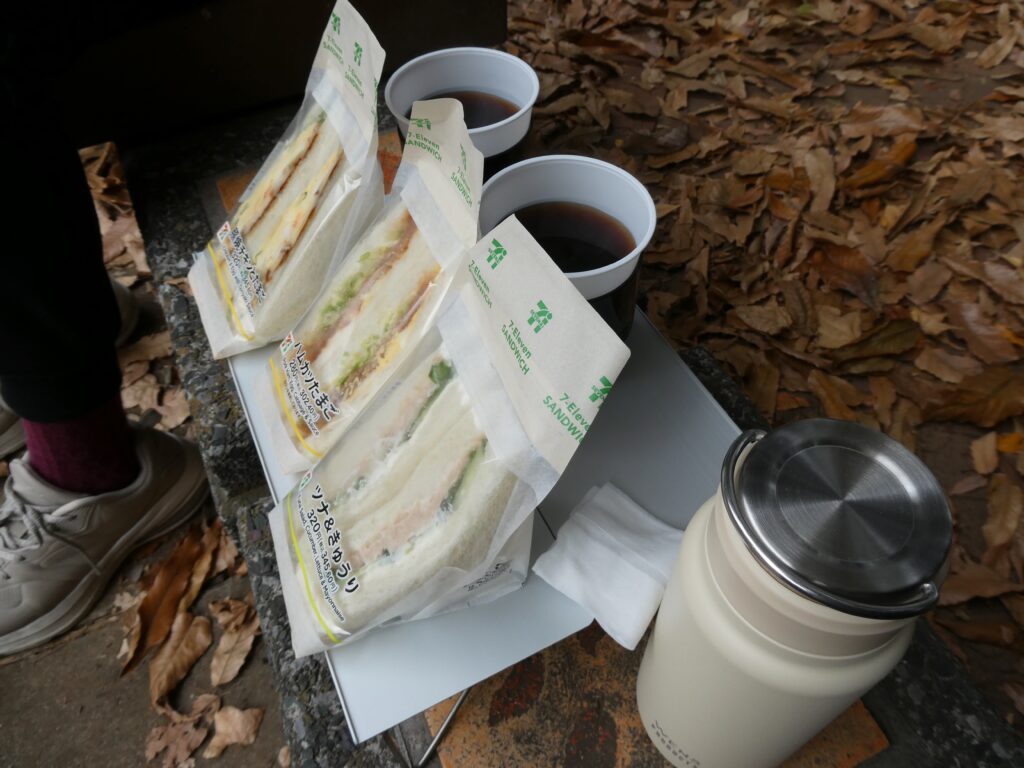 道中でサンドイッチを買った。飲み物は暖かい黒ウーロン茶を持参。