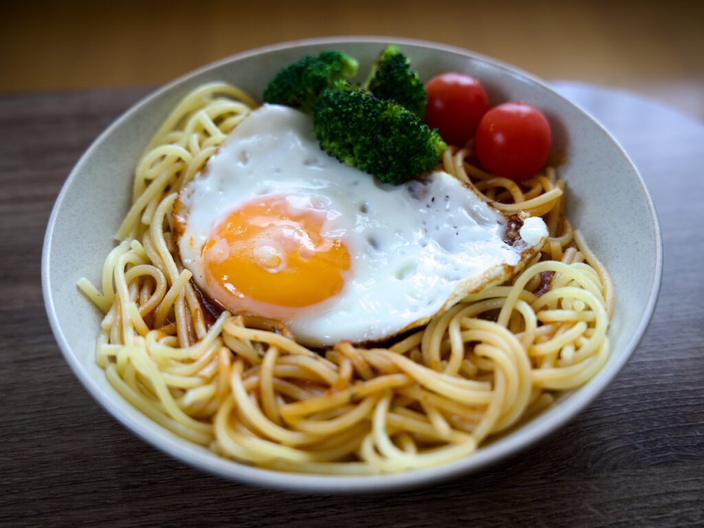 目玉焼きのせボロネーゼパスタ