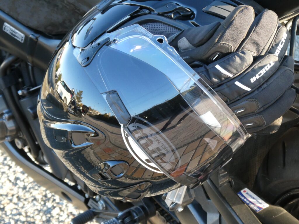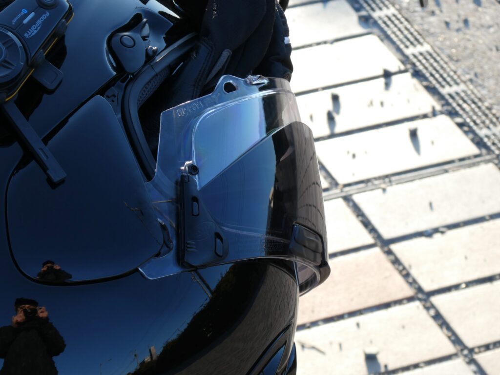 ヘルメットにアライのプロシェードシステムを使っている。冬場は横からの日差しが眩しいので、このような上げ下げできるサンバイザーがあると楽だよ。