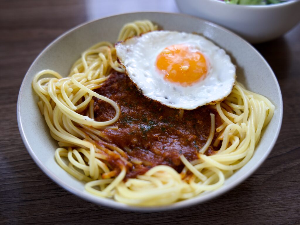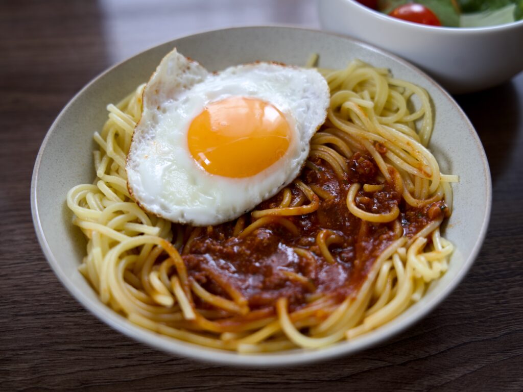 目玉焼きのせボロネーゼパスタ