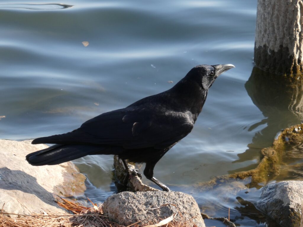 このカラス、水辺を歩いてカエルを捕まえていた。
