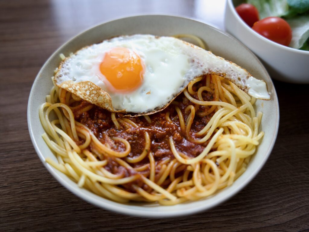 目玉焼きのせボロネーゼパスタ